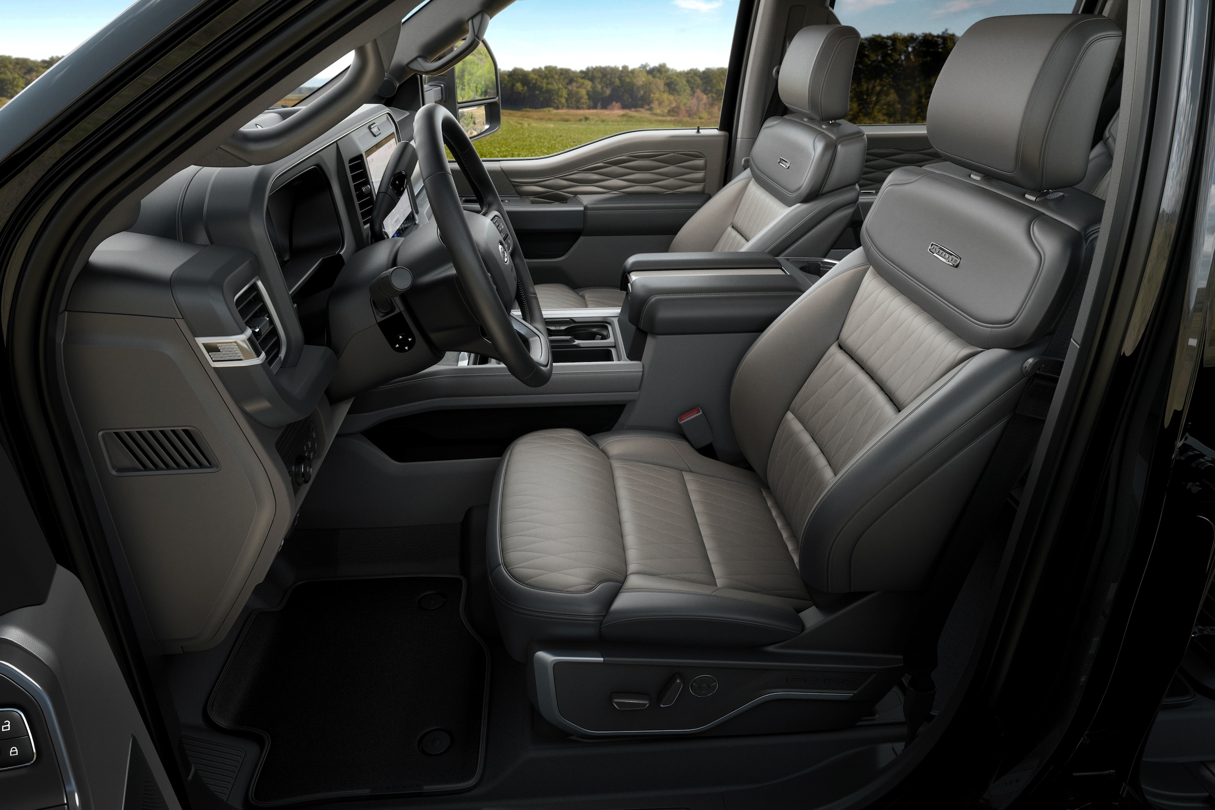 - F-250 Lariat: Introduces leather seating, dual-zone automatic climate control, 12-inch touchscreen, and power-adjustable pedals