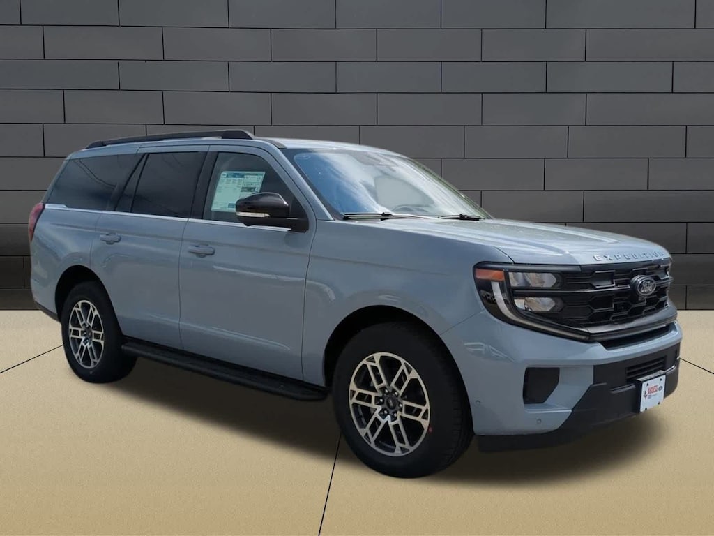 EQUIPMENT GROUP 202A HIGH PACKAGE Ford Split Gate, power upper liftgate and power lower tailgate, Wheels: 20 Carbonized Gray Bright Machined Aluminum, Premium dark tarnish-painted, dark carbonized gray-painted pockets, 360-Degree Zone Lighting, 110V/400W AC Power Outlet, 1 console outlet and one cargo area outlet, BlueCruise Equipped, 90-day trial, Not available to military sales, Universal Garage Door Opener, Power Panoramic Vista Roof w/Power Sunshade, Rain Sensing Wipers, Power Tilt/Telescopic Steering Wheel w/Memory, Memory Driver Seat, Tires: P275/60R20 AS BSW, Ford Co-Pilot360 Active 2.0, Driver State Detection, Intersection Assist, pre-collision assist w/autonomous emergency braking, pedestrian detection, forward collision warning and dynamic brake support, Front Side Laminated. 2025 Ford Expedition with Glacier Gray Metallic Tri-Coat exterior and Dark Gray interior features a V6 Cylinder Engine with 400 HP at 5200 RPM*.