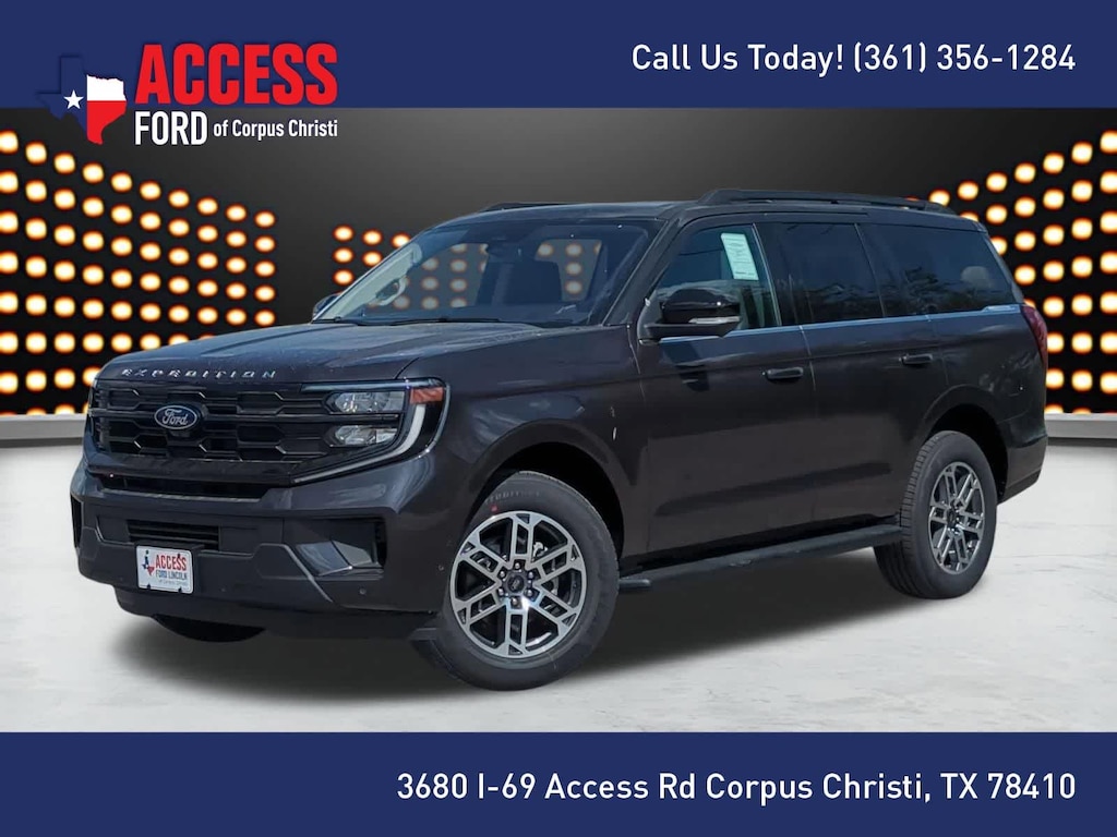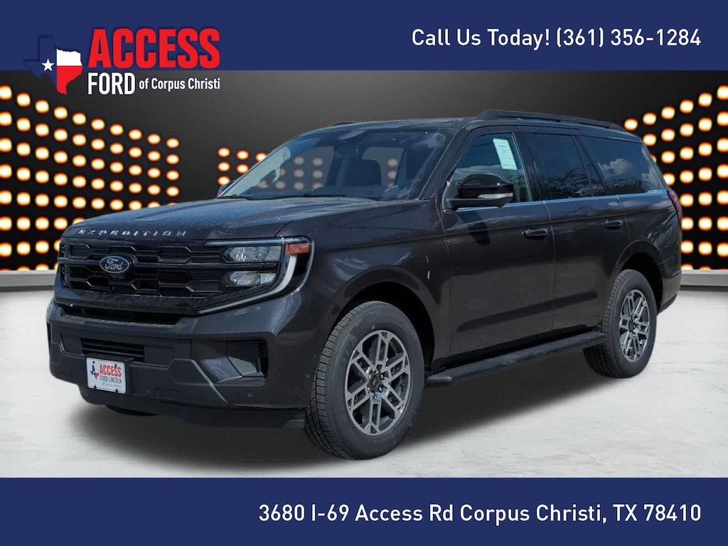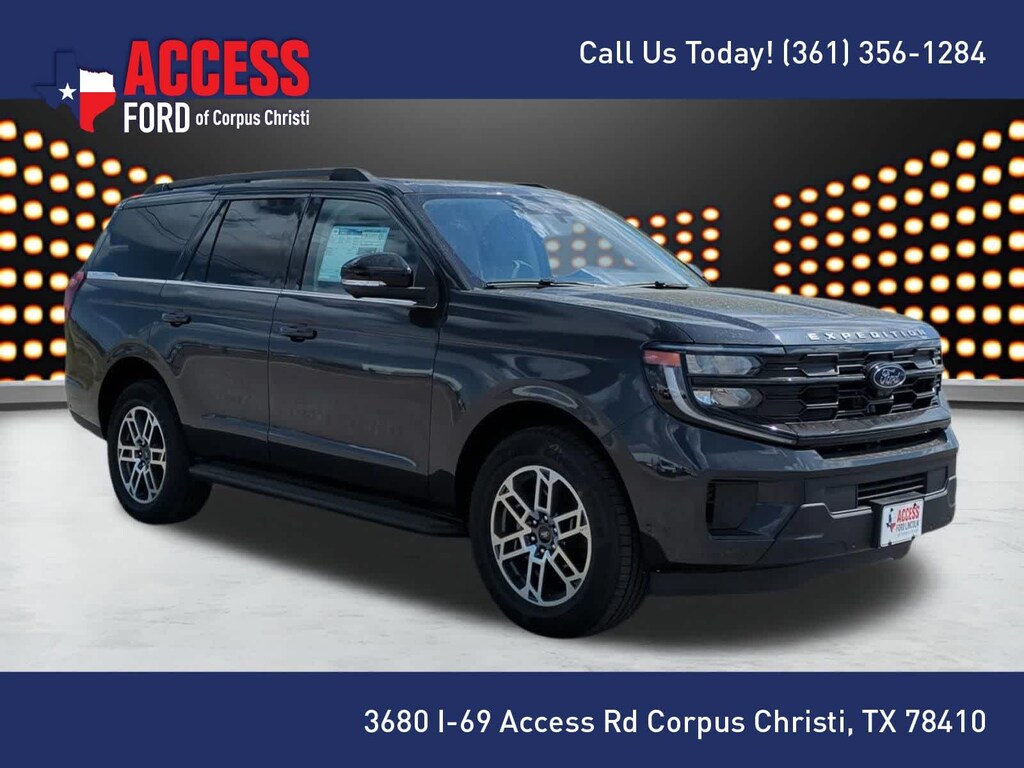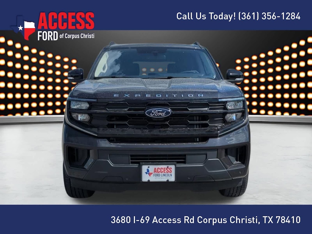 EQUIPMENT GROUP 202A HIGH PACKAGE Ford Split Gate, power upper liftgate and power lower tailgate, Wheels: 20 Carbonized Gray Bright Machined Aluminum, Premium dark tarnish-painted, dark carbonized gray-painted pockets, 360-Degree Zone Lighting, 110V/400W AC Power Outlet, 1 console outlet and one cargo area outlet, BlueCruise Equipped, 90-day trial, Not available to military sales, Universal Garage Door Opener, Power Panoramic Vista Roof w/Power Sunshade, Rain Sensing Wipers, Power Tilt/Telescopic Steering Wheel w/Memory, Memory Driver Seat, Tires: P275/60R20 AS BSW, Ford Co-Pilot360 Active 2.0, Driver State Detection, Intersection Assist, pre-collision assist w/autonomous emergency braking, pedestrian detection, forward collision warning and dynamic brake support, Front Side Laminated. 2025 Ford Expedition with Dark Matter Gray exterior and Dark Gray interior features a V6 Cylinder Engine with 400 HP at 5200 RPM*.